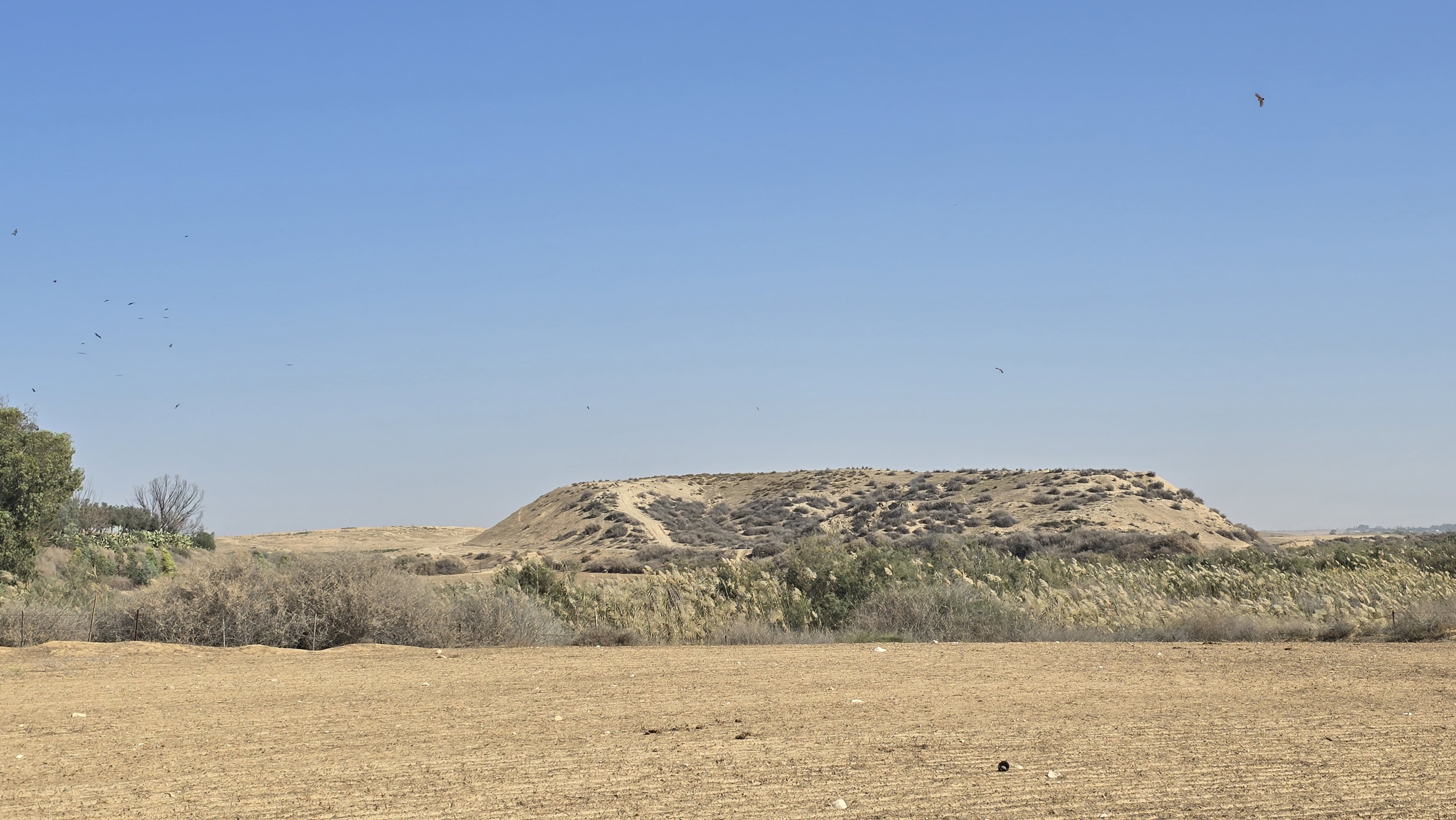 תל שֶׁרַע\אַ-שַרִיעַה - צילום מכוון דרום. נחל גרר נראה עובר בבסיס התל.